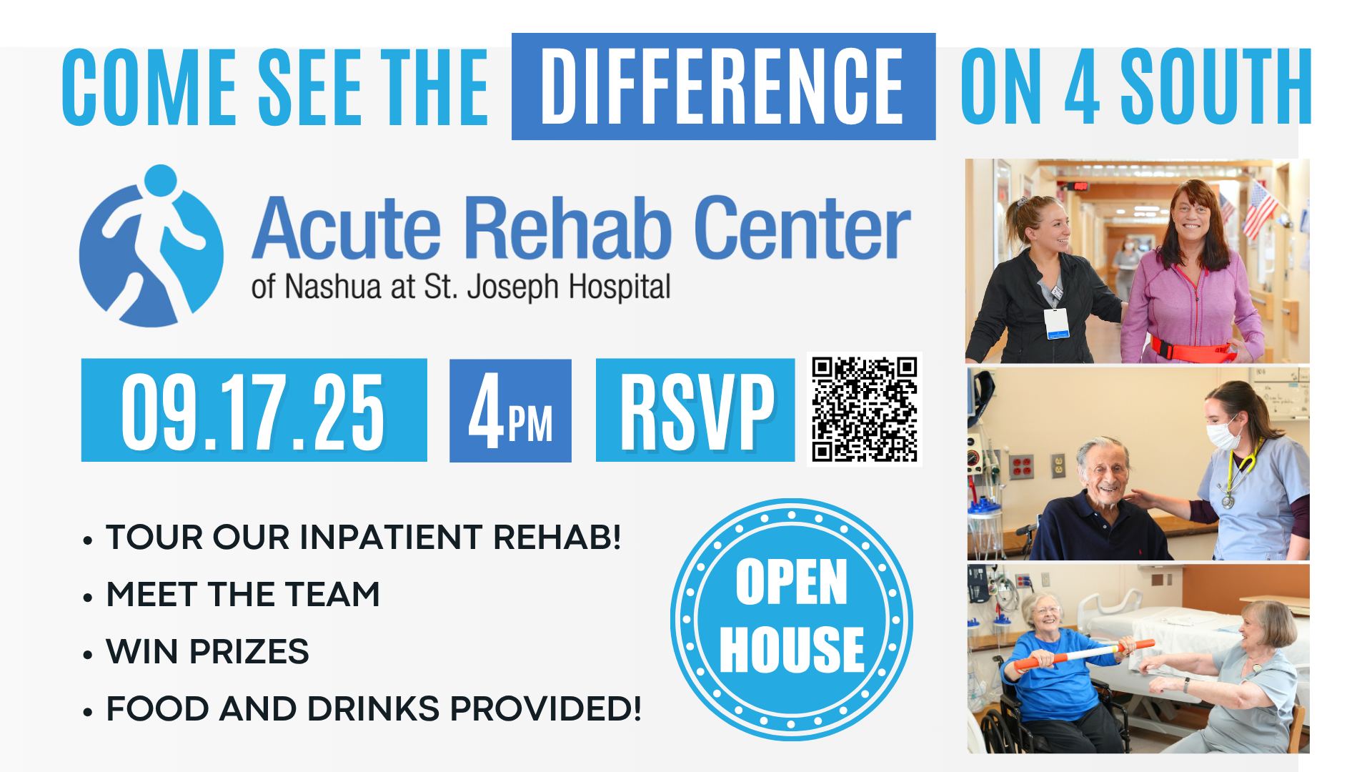 Join us for an exciting Open House event to celebrate the newly updated Acute Rehab Center of Nashua at St. Joseph Hospital! This is your chance to explore our state-of-the-art facility, meet our dedicated staff, and learn about the exceptional care we provide to our patients. What to Expect: Guided Tours: Discover our modernized rehabilitation